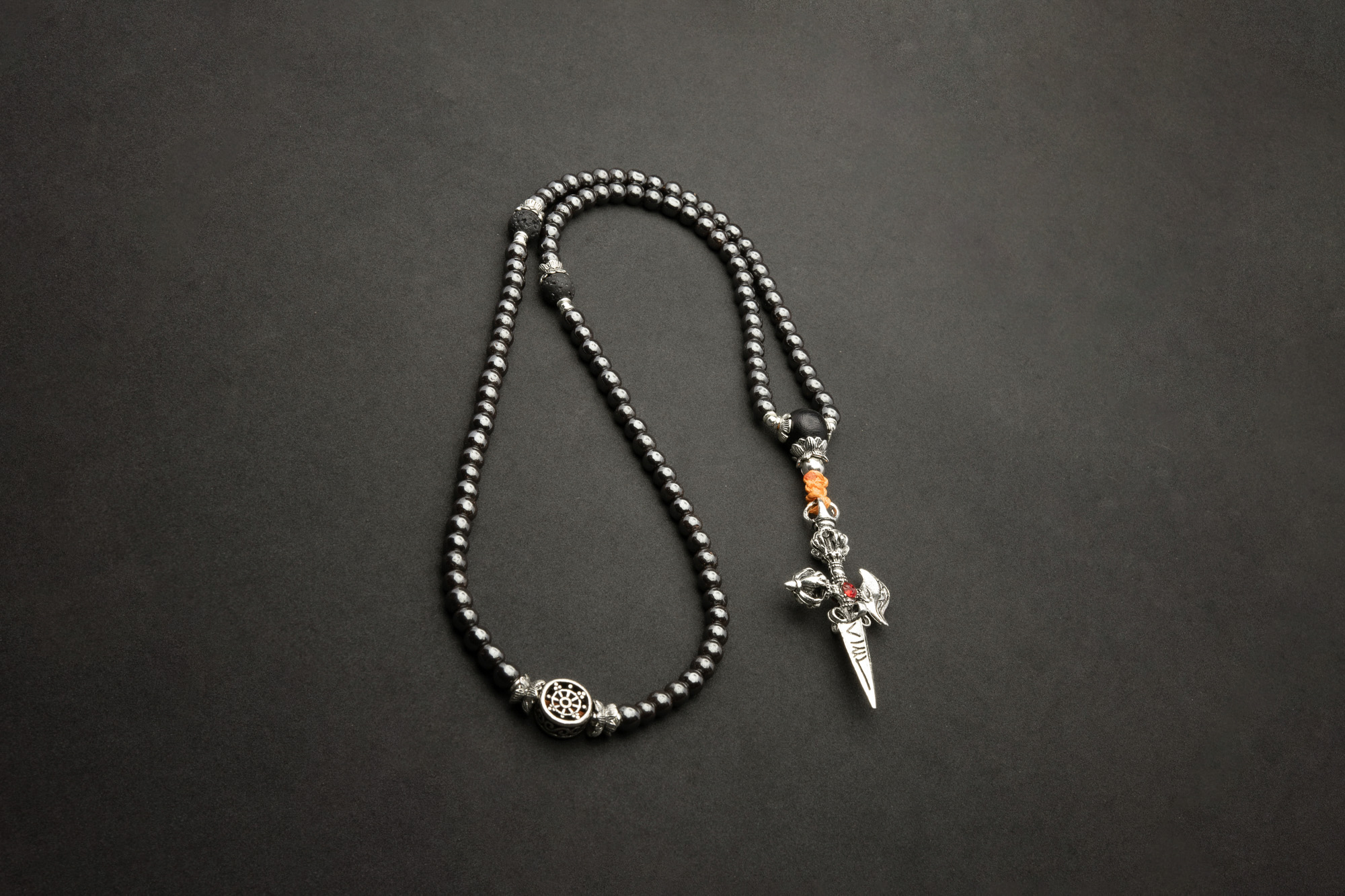 Japamala tradicional de 108 contas confeccionado artesanalmente em cordão encerado especial com HEMATITAS de aproximadamente 8mm. Separadores LAVA VULCÂNICA (Pomes), Lótus e Roda do Darma. Merú madeira de pessegueiro, lótus. Pendante amuleto PHURBA KARTIKA. Metais em liga tibetana.