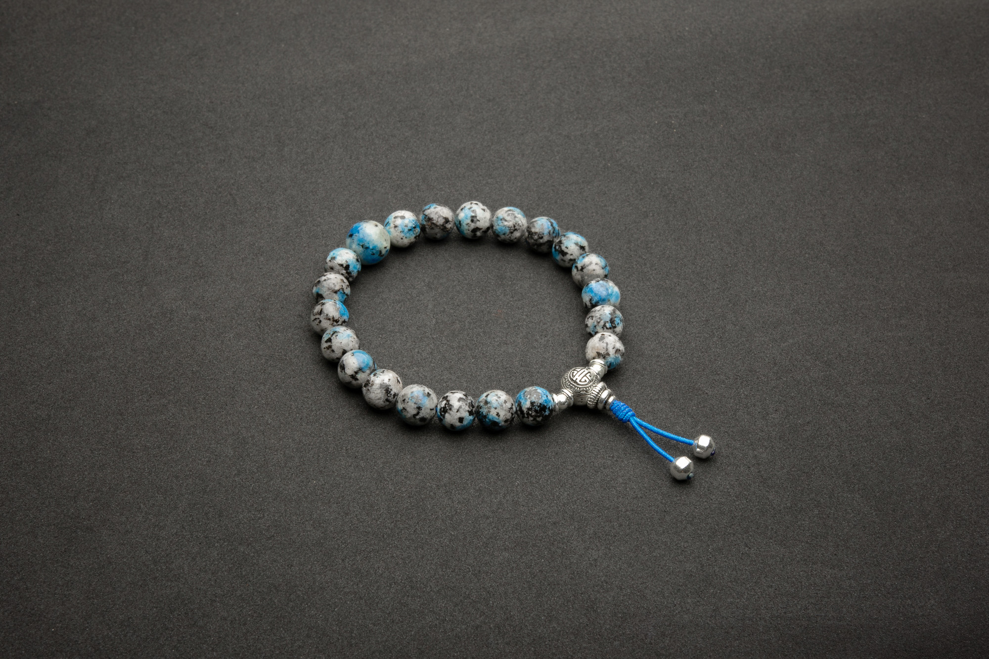 Pulseira japamala 21 contas confeccionada artesanalmente em cordão elástico com GRANITO "JASPE" K2 paquistanês de aproximadamente 7,5mm . Merú AMULETO DA PROSPERIDADE em liga tibetana banhada a prata. Terminação em hematita banhada a prata.